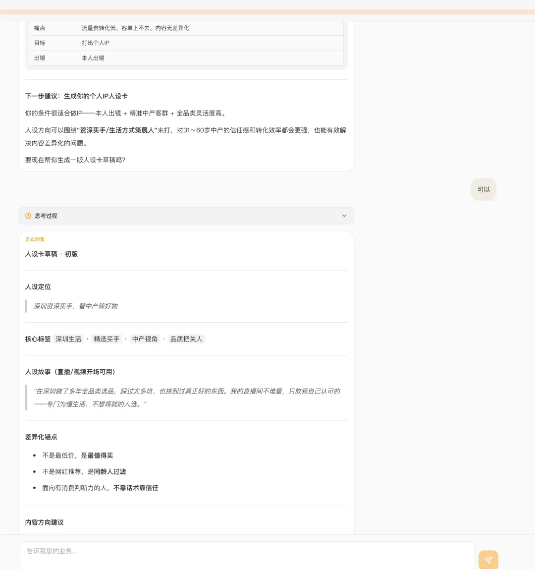 它不是让你填表,是跟你聊天。就像你跟一个懂你行业的朋友在喝茶,你说着说着,它帮你把故事理出来了。
