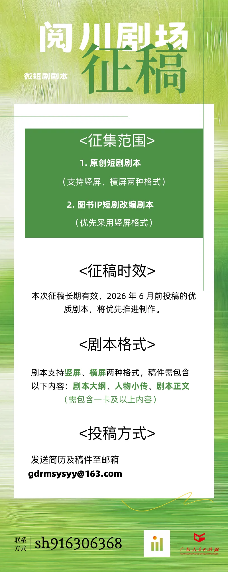 为进一步推动优质原创微短剧创作与出版融合发展,挖掘优秀短剧编剧人才,广东人民出版社现面向广大编剧及创作者公开征集微短剧剧本。