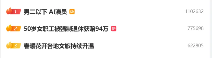 近日,“男二以下AI演员”话题冲上微博热搜第一,阅读量瞬间破亿。