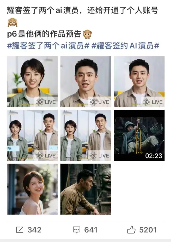 尽管事后多家短剧制作公司回应称“目前还做不到,AI演员和真人演员没法在同一图层”,耀客传媒却在高调官宣签约两位AI数字艺人。