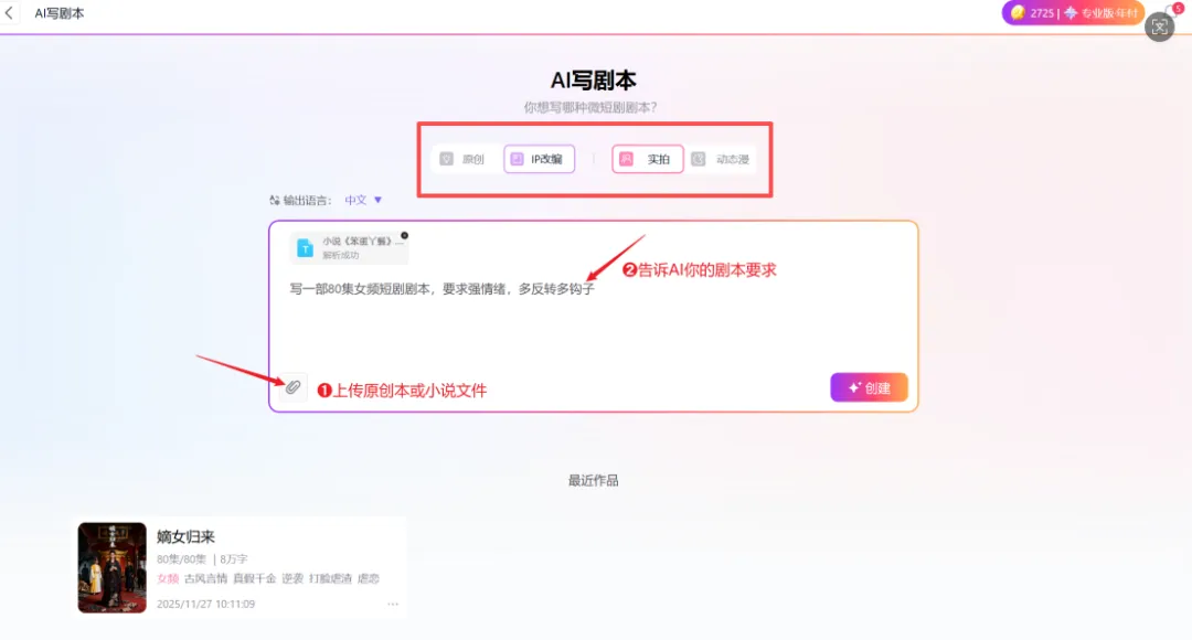 打开创一AI 官网,点击【AI 写剧本】入口,先选创作类型 —— 想做小说转剧本就选 “IP 改编”,还能根据平台要求选 “真人实拍” 或 “AIGC 动态漫”,输出语言也能随便选,投海外平台也不用额外翻译。然后直接上传小说素材,支持 word、txt、pdf 格式,最多能传 80 万字,不用提前拆分章节,整本书传上去就行。