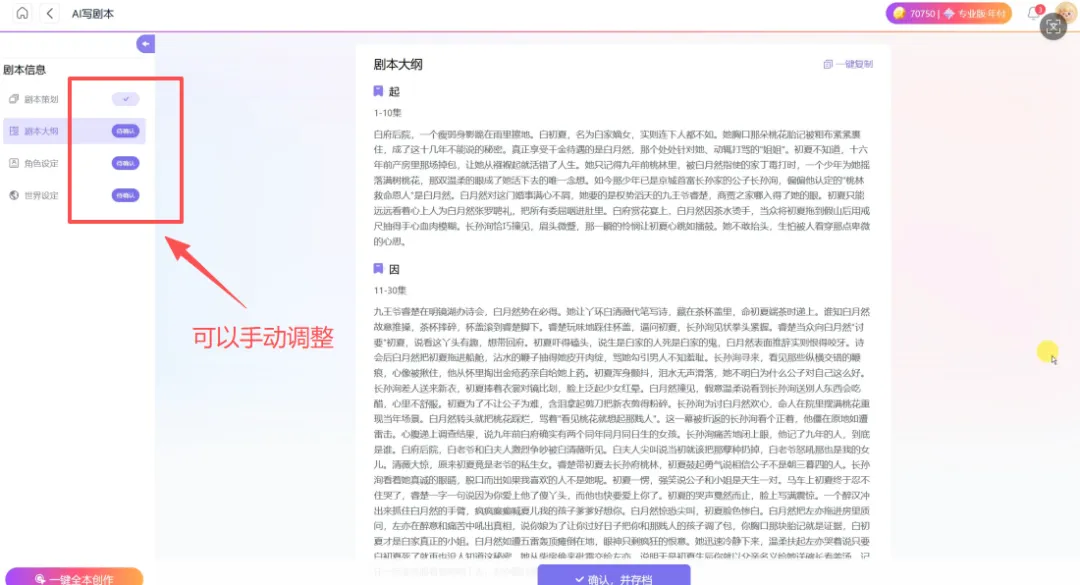 提交需求后,创一AI 会在几分钟内自动生成剧本策划,包括剧名、题材、六幕式大纲、人物设定还有世界设定,把剧本的核心框架都搭好。我会花 10 分钟快速核对,重点看大纲是否贴合小说主线,人物设定有没有偏离原著,冲突节点设计得是否合理,要是有不合适的地方,直接在页面上手动修改就行,特别方便。