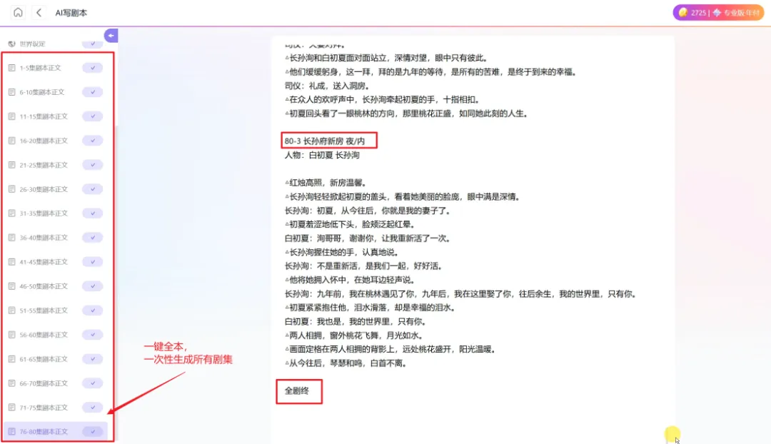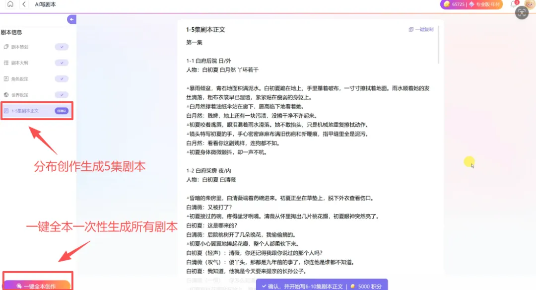核对完策划,就可以生成剧本正文了,我建议选 “分步创作”,每次生成 5 集,不要一键全本。这样可以逐集看内容,避免出现逻辑断层;而且要是某一集的内容不满意,可以直接让 AI 重写,不用整本书推翻。创一AI 生成的初稿,已经严格按照短剧格式标注了场景、人物、动作、台词,连每集的钩子都设计好了,首稿可用率能达到 70% 以上。