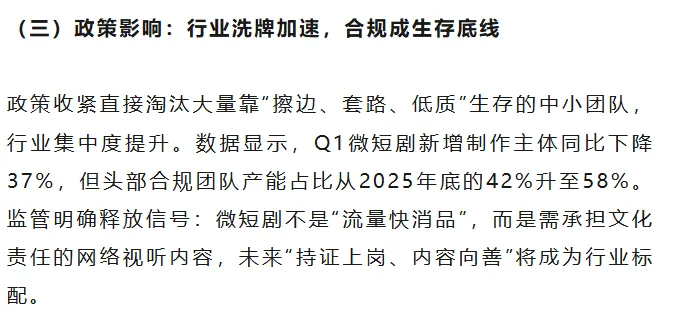 2026年第一季度,微短剧新增制作主体同比下降37%,行业主动淘汰低质低效产能,头部合规团队产能占比从2025年底的42%升至58%,行业向高质量、精品化转型的结构性调整趋势愈发明显。