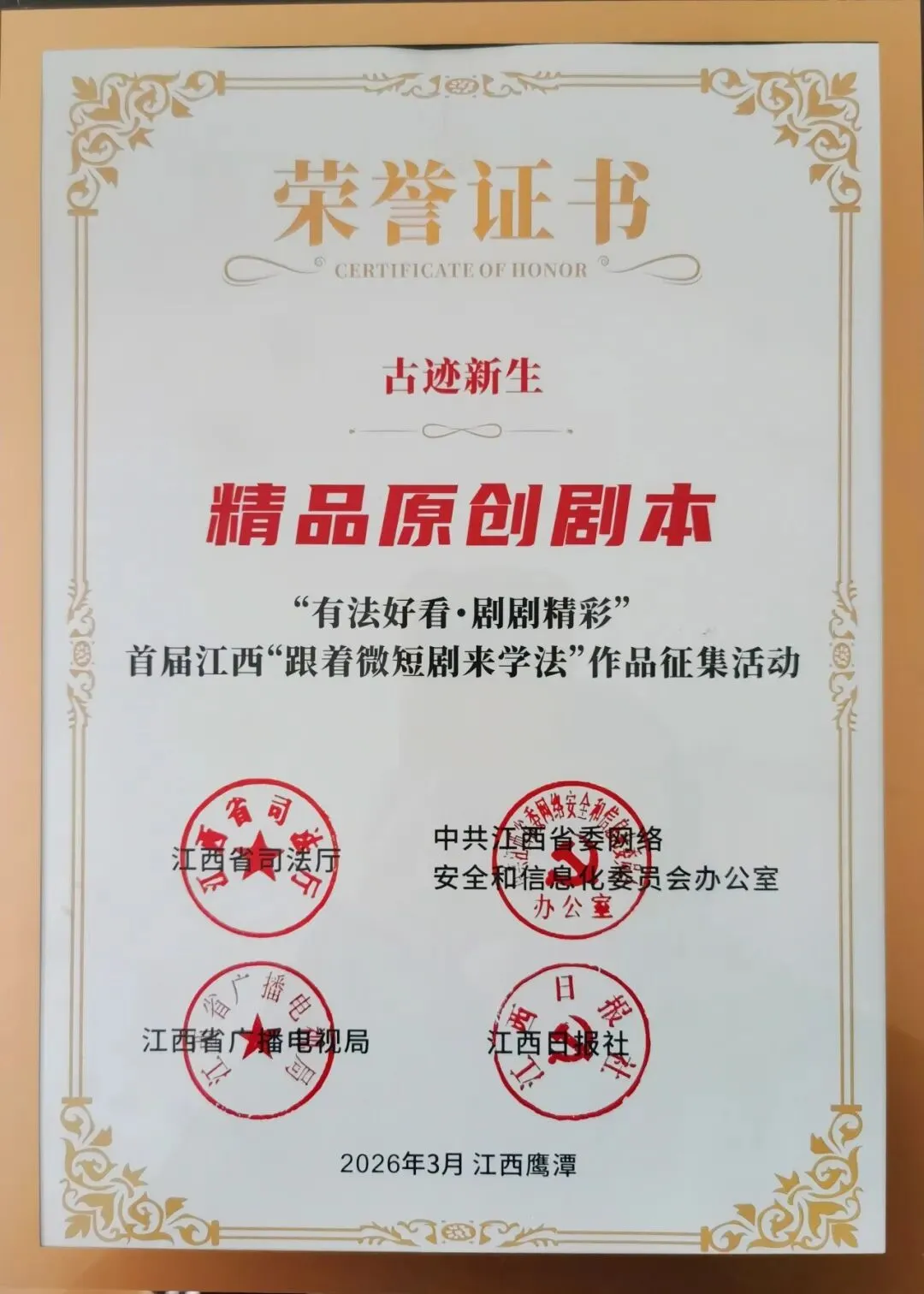 近日,由江西省司法厅、省委网信办、省广播电视局、江西日报社主办、鹰潭市司法局、赣法云客户端、新法治报社承办的首届江西“跟着微短剧来学法”作品征集活动中,贵溪市检察院干警王明青、冯晨霞主创的《古迹新生》在本次评选中被评为精品剧本。