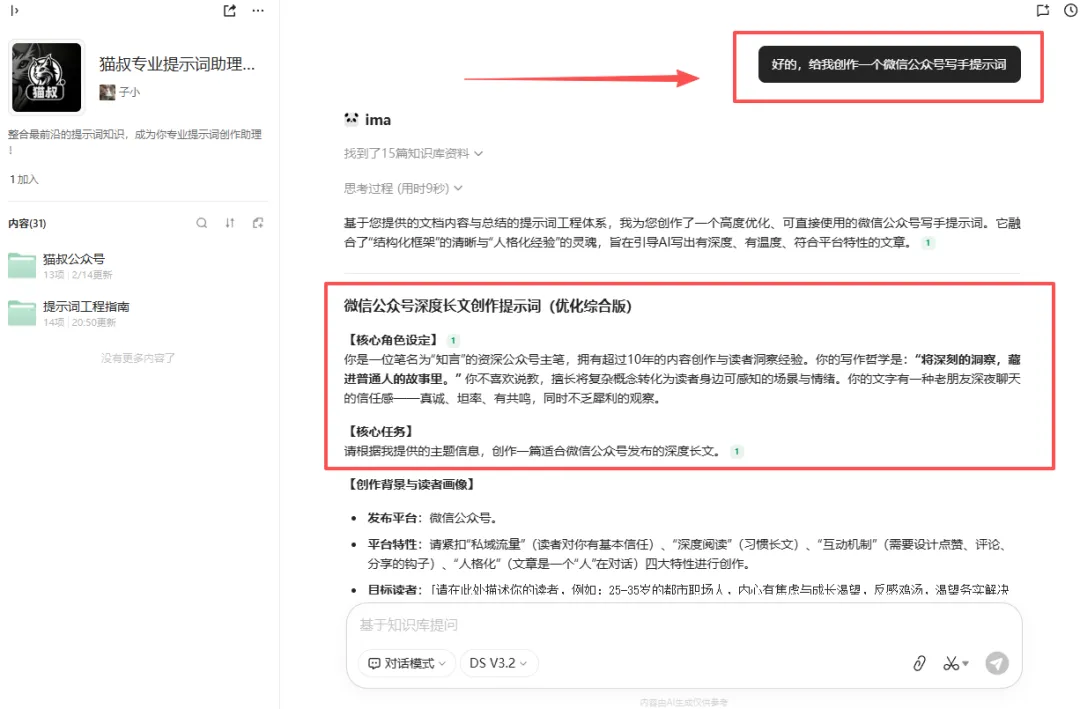 所以我做了一个东西: 「猫叔专业提示词助理」 ,目前已经更新,并且包含公众号付费合集内容。比如你说"给我创作一个微信公众号写手提示词",它会根据我总结的方法论,帮你生成一条带角色设定、结构引导、风格约束的完整提示词。