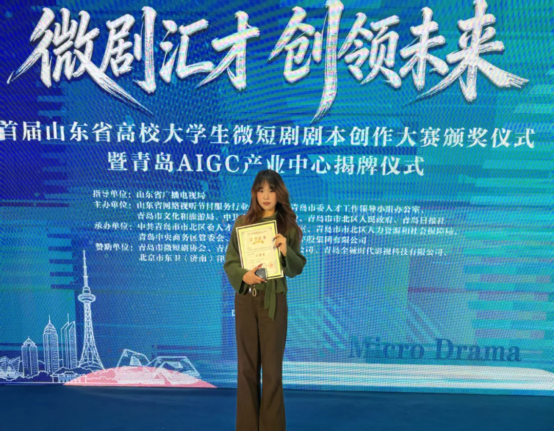 近日,由山东省广播电视局指导,山东省网络视听节目服务行业协会等单位联合主办的首届山东省高校大学生微短剧剧本创作大赛圆满落幕。我系学子刘湘怡同学凭借立意深刻、叙事成熟的原创剧本脱颖而出,荣获大赛三等奖,成为本届大赛唯一获奖的高职院校学生,充分展现了我系智能视听创意与制作专业群扎实的育人成效。