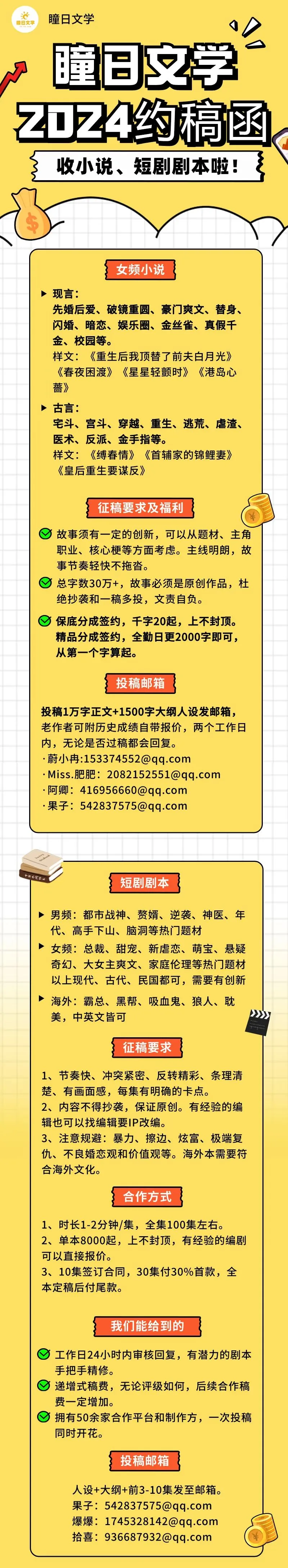 瞳日文学2024约稿函,收女频小说+短剧剧本!