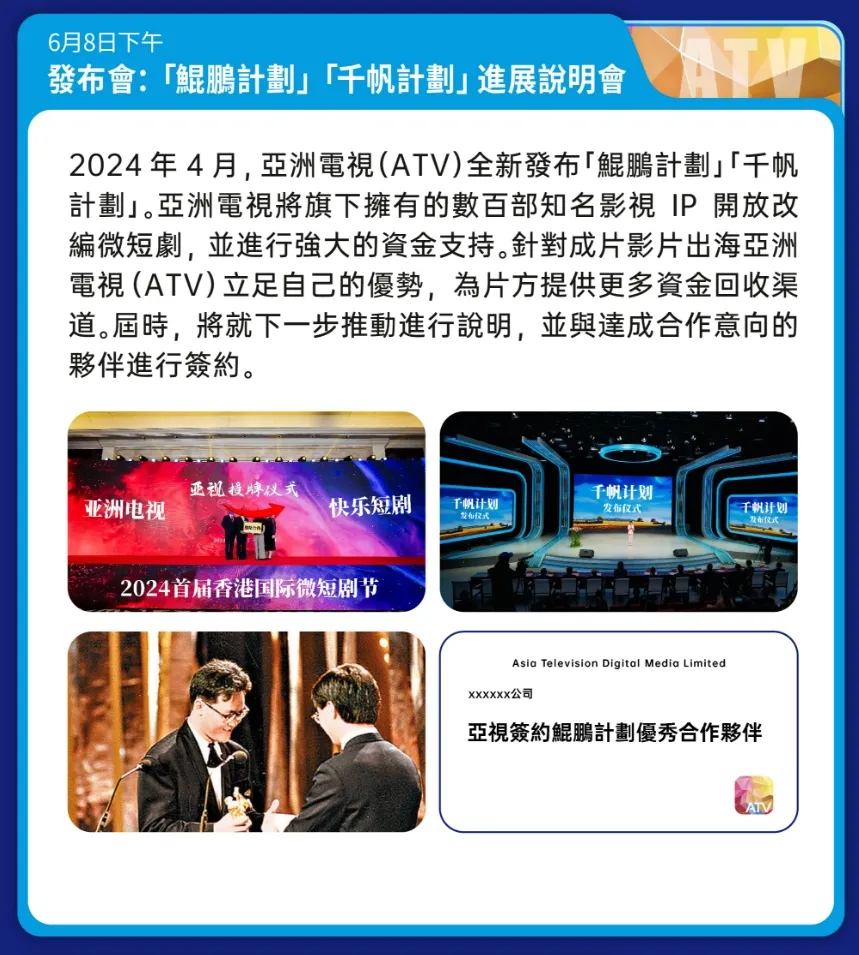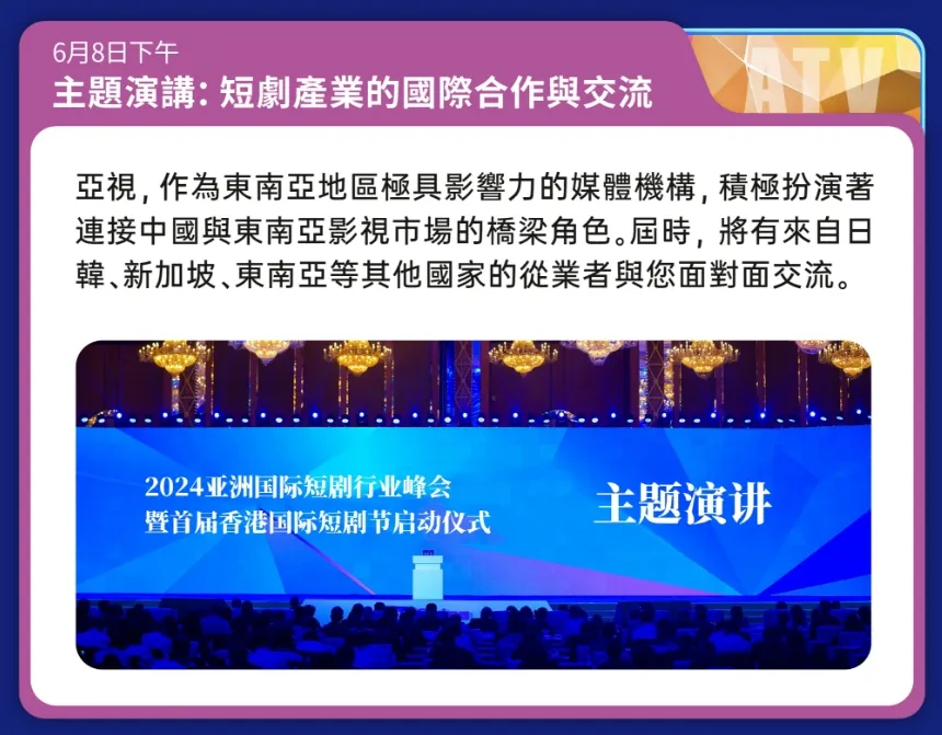 此外,亚视将出席短剧自习室主办的大会,在4月24日国内主场和4月25日出海场,针对「鲲鹏计划」「千帆出海计划」「2024亚洲微短剧行业峰会暨首届香港国际微短剧节启动仪式」进行发布和细节解读,在此欢迎对相关计划感兴趣或有疑问的小伙伴来参加短剧自习室主办的“2024第二届短剧生态大会”(点击蓝字可跳转报名),到现场了解沟通~