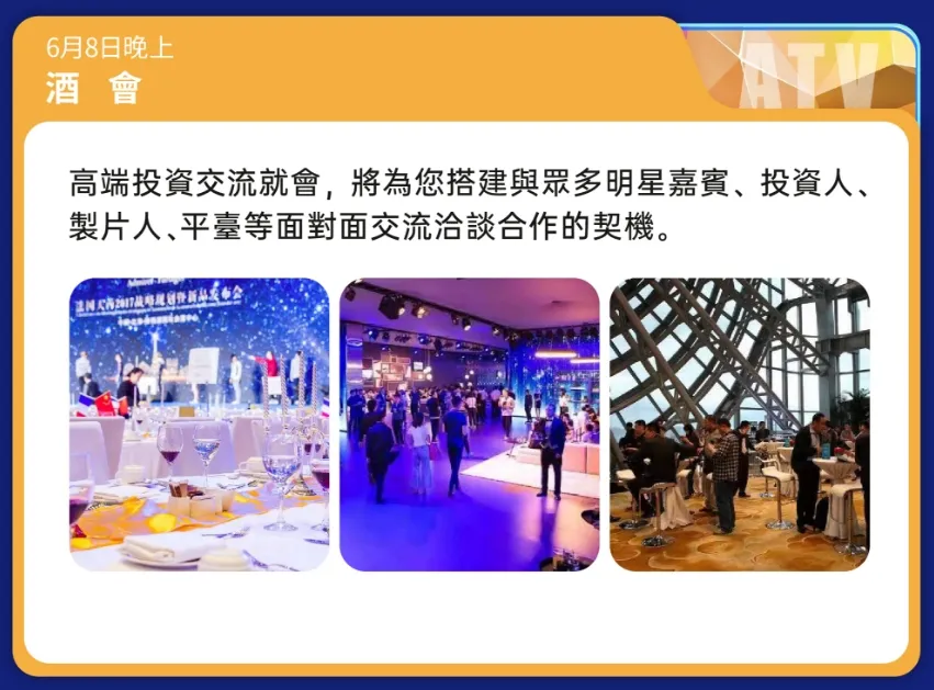 (夜晚场)高端投资交流酒会,届时将搭建与众多明星嘉宾、投资人、制片人、平台等面对面交流洽谈合作的契机。