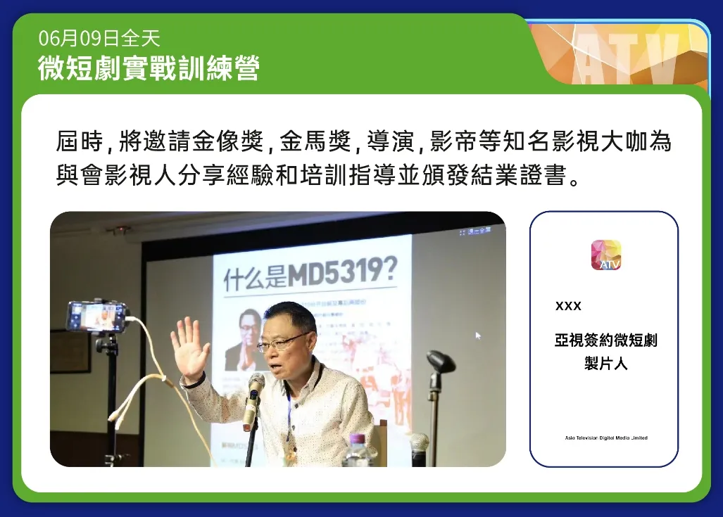 此次实战培训主要是招募内地的编剧、导演、制片,以辅助实现亚视百部IP落地。各微短剧方通过报名亚视此前发布的「鲲鹏计划」,如果评选通过就可以与亚视直接签约,届时将邀请金像奖、金马奖的导演、影帝等知名影视大咖为与会影视人分享经验和培训指导,参与培训者都将获得证书。