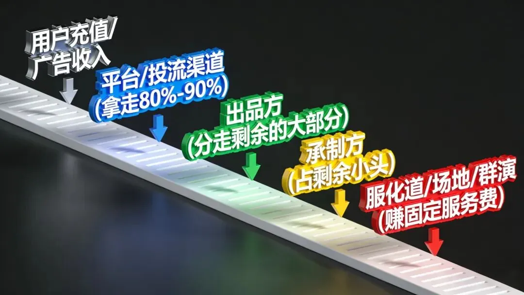 用户充值/广告收入 → 平台/投流渠道(拿走80%-90%)→ 出品方(分走剩余的大部分)→ 承制方(赚制作费,占剩余小头)→ 服化道/场地/群演(赚固定服务费)
