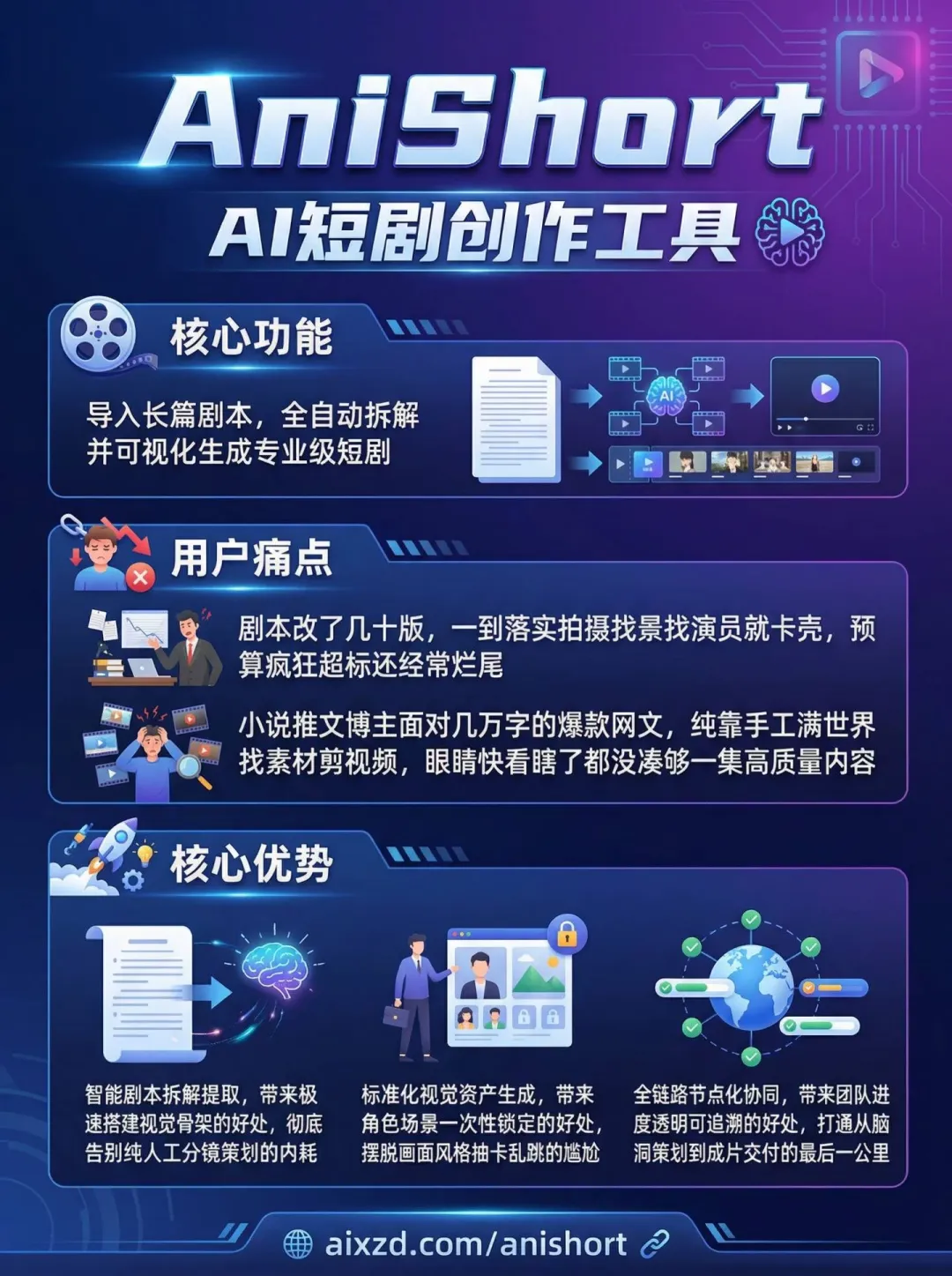在短视频内容极速爆发的当下,观众的胃口越来越挑剔,传统的动画短剧制作周期长、成本高昂,让许多创作者望而却步。AniShort带着打破这种僵局的使命应运而生,不仅彻底打通了从创意文字到震撼画面的所有环节,还为内容创作团队提供了一个极其丝滑的在线协作空间。这套全链路数字引擎把复杂的创作门槛直接踩碎,让每一位创作者都能把脑海里天马行空的故事迅速变成吸引眼球的连续短剧,真正开启降本增效的新时代。1. 剧本智能解析与分镜规划