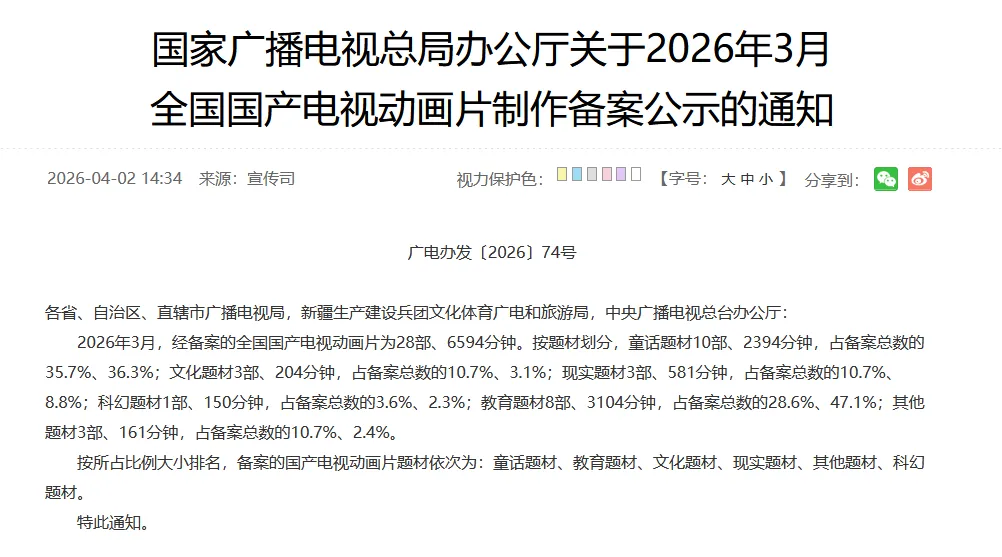 4月1日起,国家广电总局AI动画微短剧分类分层备案管理政策正式强制执行,全品类短剧纳入监管体系。