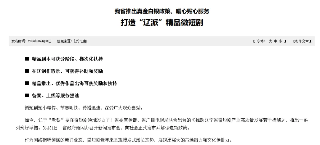 辽宁:3月31日发布20条扶持措施,4月1日实施。在辽拍摄短剧享20%配套费用补助,播映收益超200万作品享20%投资额补助;AI研发投入按20%补助,普通备案5个工作日反馈,政策可叠加申领,短剧人才纳入“兴辽英才计划”。