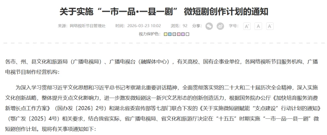 湖北:4月上旬发布专项政策,开展红色题材微短剧创作展播并予资金扶持;实施“一市一品、一县一剧”计划,2030年底前实现各市、县打造本土特色短剧,优质项目享资金+宣推双重支持。