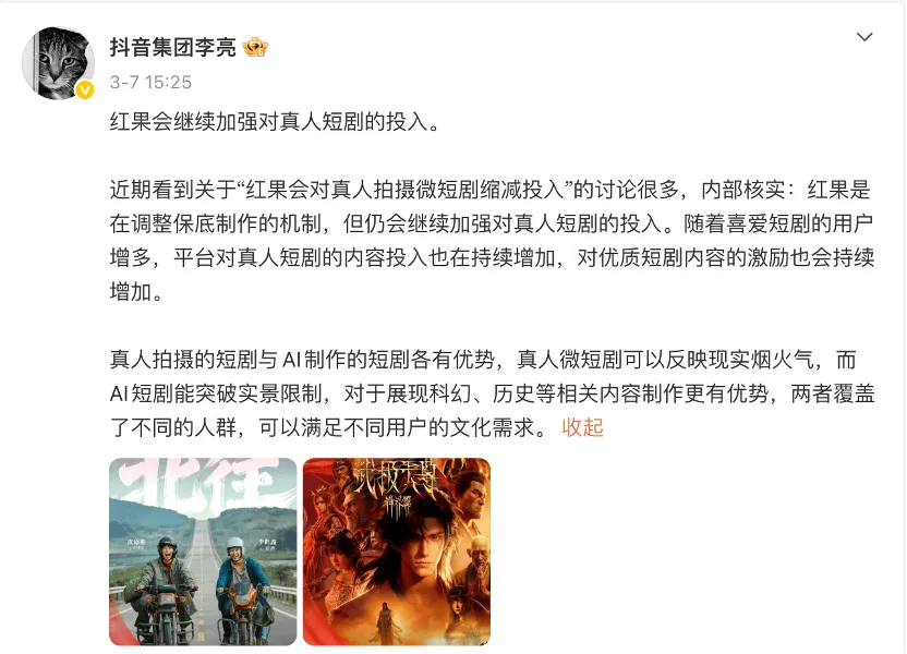 尽管平台负责人在随后的回应中强调:“是调整保底制作的机制”,未来仍会加强对真人短剧的投入。但这一系列变化,已经对不少制作公司造成了实实在在的冲击。