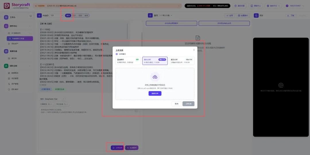 - 上传成熟剧本:选择「直接解析」,快速生成结构化剧本;