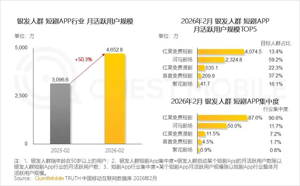 在银发市场,短剧消费增长势头尤为强劲。数据显示,目前已有超 4653 万银发用户通过独立 APP 观看短剧,用户规模同比大幅增长50%,成为拉动行业增长的重要力量。