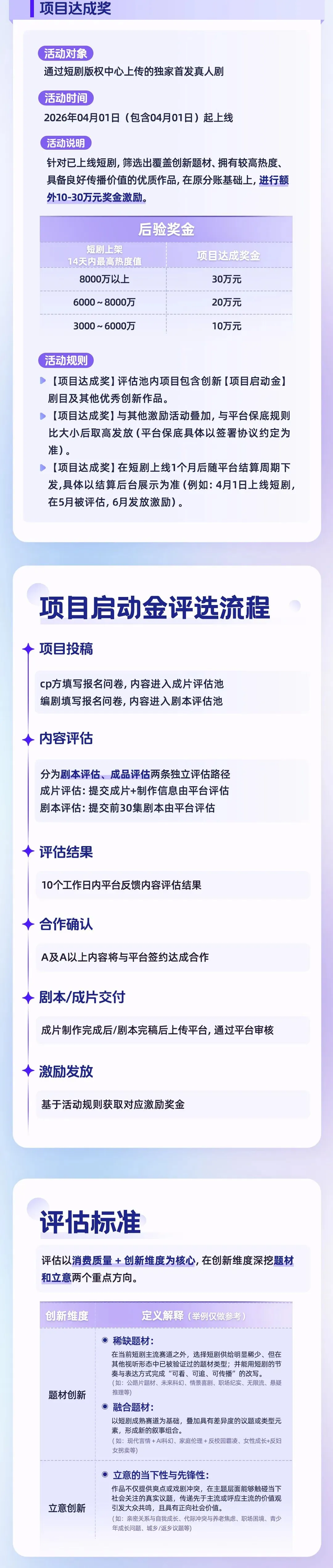 活动提供两种合作模式:成片合作可获得项目启动金,其中超头部作品最高可达400万元;剧本合作则在常规剧本保底金的基础上,叠加发放单独的完稿激励,额外奖金最高为3万元。评估以消费质量与创新维度为核心,创新维度重点考察题材和立意,鼓励稀缺题材和融合题材的探索。对于评级为S级的成片剧目,平台还将视情况提供宣发资源与运营定向扶持。