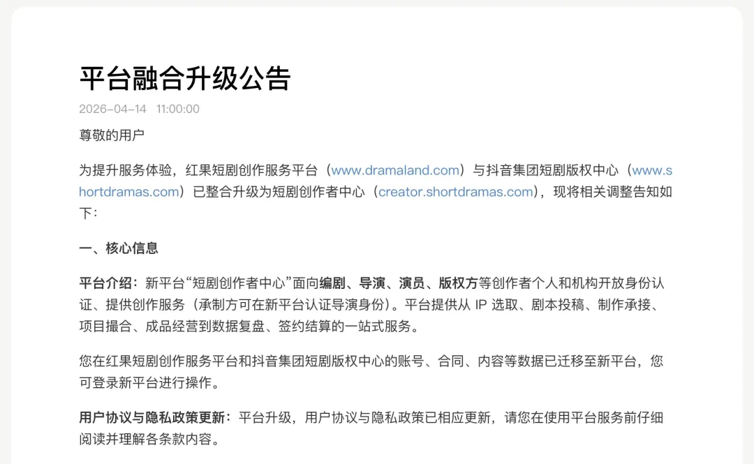 “短剧版权中心”与“红果短剧创作服务平台”正式整合升级为**“短剧创作者中心”**。原平台的账号、合同、内容全部迁移,一站式搞定从IP到结算的全流程。