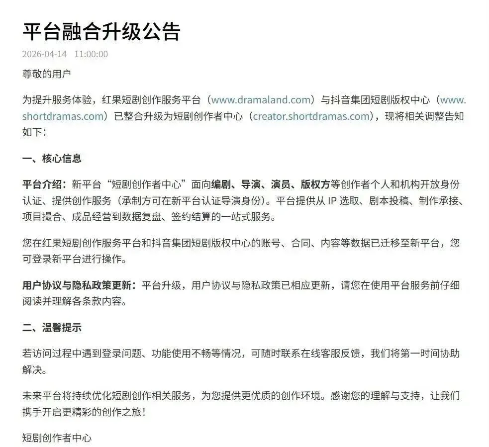 据了解,新成立的短剧创作者中心将面向编剧、导演、演员、版权方等创作者个人和机构开放身份认证、提供创作服务。平台将提供从IP选取、剧本投稿、制作承接、项目撮合、成品经营到数据复盘、签约结算的一站式服务。