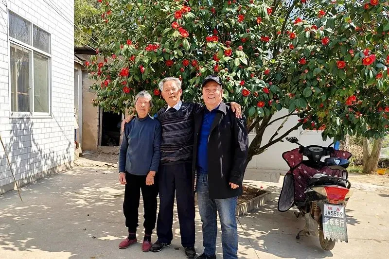 图为作者苏昉采访徐尚文先生后,与徐先生夫妇在茶花树前合影。