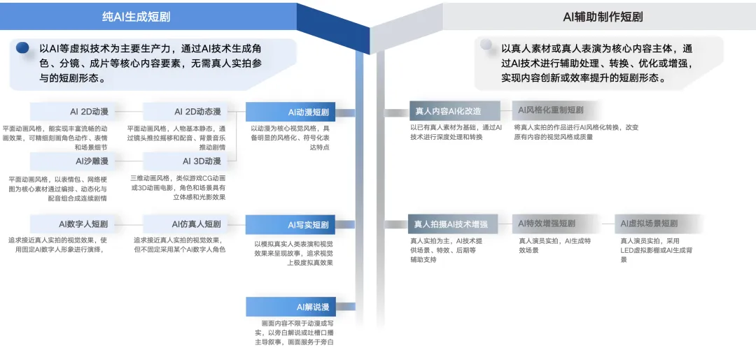 在形态分类上,AI短剧按“技术参与程度”划为两大类:纯AI生成与AI辅助制作。