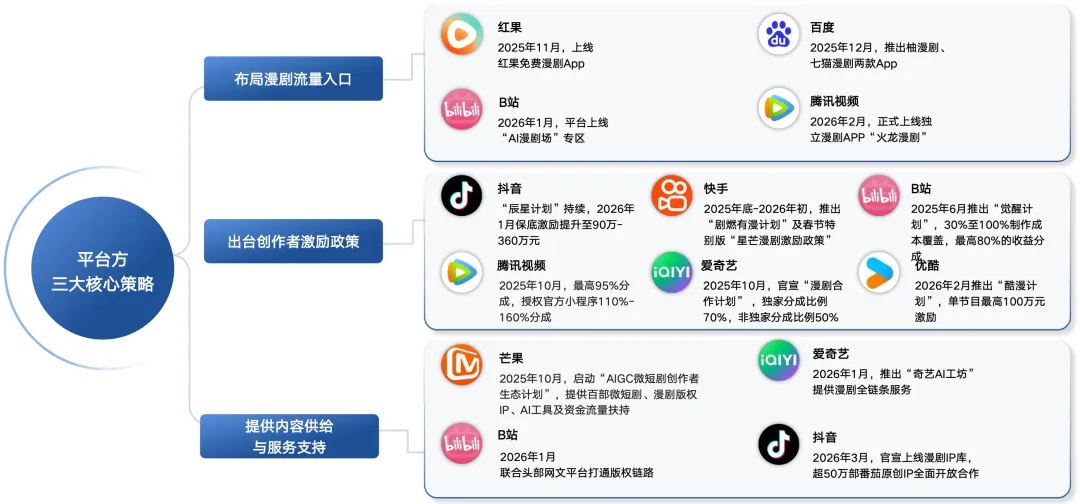 平台端的动作更像“加速器”。平台的三类核心策略:争夺入口、加大激励、打通版权链路并提供工具服务。 例如抖音强化激励与IP开放合作,哔哩哔哩上线AI漫剧场专区并加强版权链路协同,腾讯视频则通过推出火龙漫剧等方式加码独立分发与供给侧建设。