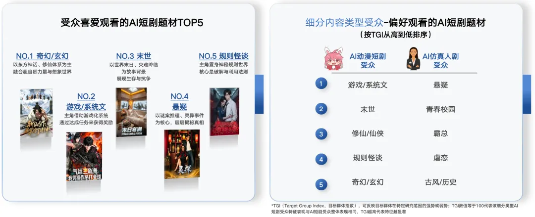 内容偏好方面,AI短剧的“题材结构”有鲜明共性:整体TOP5更集中在奇幻/玄幻、游戏/系统文、末世、悬疑与规则怪谈,说明它在“强设定+强爽感+强叙事钩子”的组合上更具优势。 细分到年龄段,18—34岁更偏好游戏/系统文与规则怪谈等元素;35—44岁则更偏好修仙/仙侠与规则怪谈,并出现甜宠、末世等题材的组合偏好。 这也解释了为什么AI短剧常被描述为“更像视觉化小说”:它用更低的边际成本,把网文中高频的强设定爽点直接视觉化。