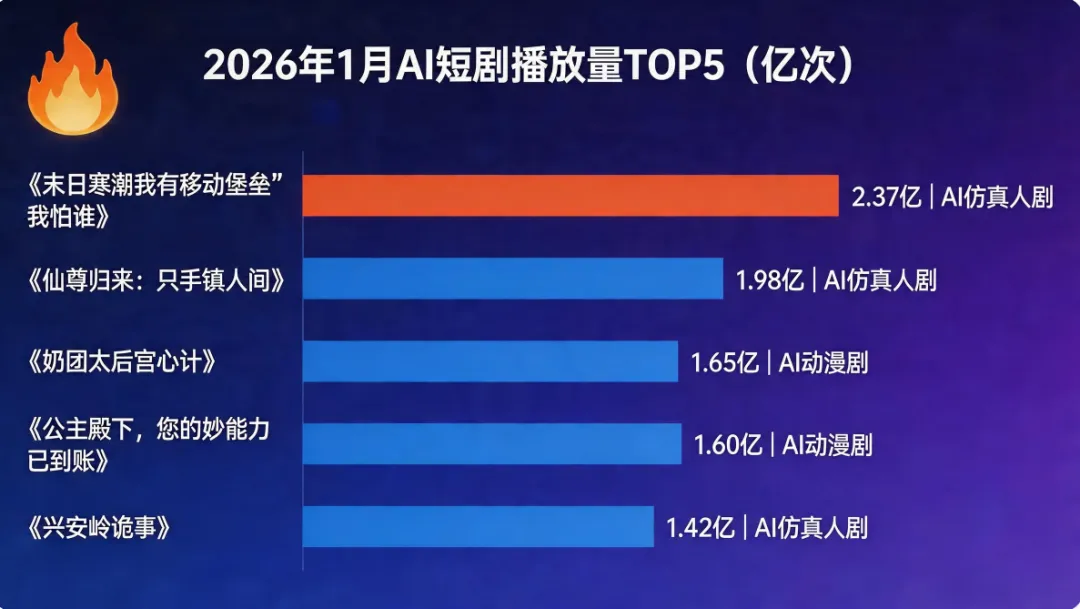 更值得关注的是增速。2025年下半年,AI短剧的播放量环比增长曲线几乎是一条陡峭的上扬线。头部作品的播放量级,已经从“百万”跨越到“亿”——《末日寒潮我有移动堡垒我怕谁》单月播放量达到2.37亿,这个数字放在一年前,没人敢信。