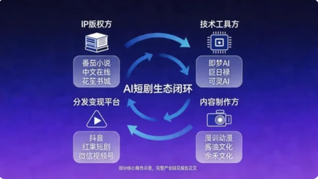 头部平台已经开始构建“IP源头→AI制作→流量分发→商业变现”的全链闭环。典型如番茄小说:番茄提供IP供给,即梦AI提供工具生成,抖音负责内容分发,红果平台完成商业变现——一条完整的自循环体系已经跑通。