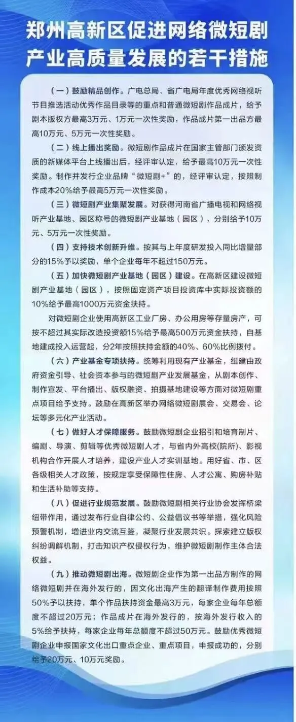 从个人创作者到头部制作公司,从拍摄基地到出海发行,郑州高新区这波政策,不是单点砸钱,而是给微短剧产业搭了一套完整的扶持体系。当越来越多的城市开始布局短剧赛道,郑州高新区的这份政策,无疑是打出了一张差异化的王牌。未来,这里会不会成为继横店、象山之后,又一个微短剧产业的新高地?我们拭目以待。