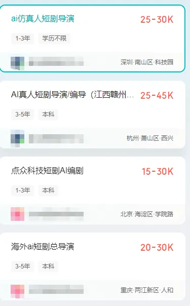 全职岗位方向:AI短剧导演(15K-30K/月)、AI剧本创作师(12K-25K/月)、AI视觉设计师(10K-20K/月)、智能剪辑师(8K-18K/月)、AI内容运营(10K-22K/月)。